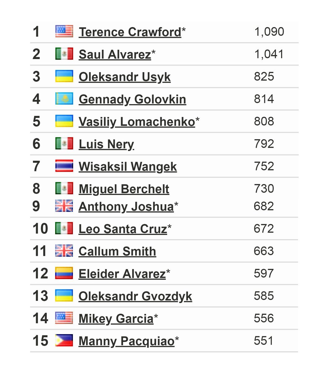 Оновлену версію рейтингу бійців незалежно від вагової категорії представив портал BoxRec - ресурс, який веде статистику сучасного боксу.