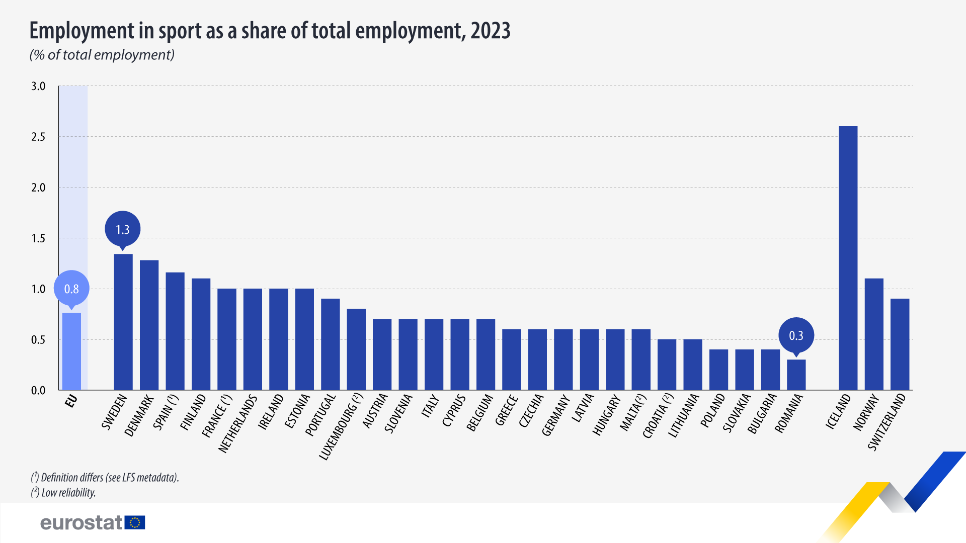 Серед країн Євросоюзу в Швеції частка людей, які працюють у сфері спорту, є найбільшою – 1,33% від загальної зайнятості в країні. Більше одного відсотка зайнято в спортивному бізнесі в Данії – 1,25% та Іспанії – 1,16%, повідомляє Євростат.