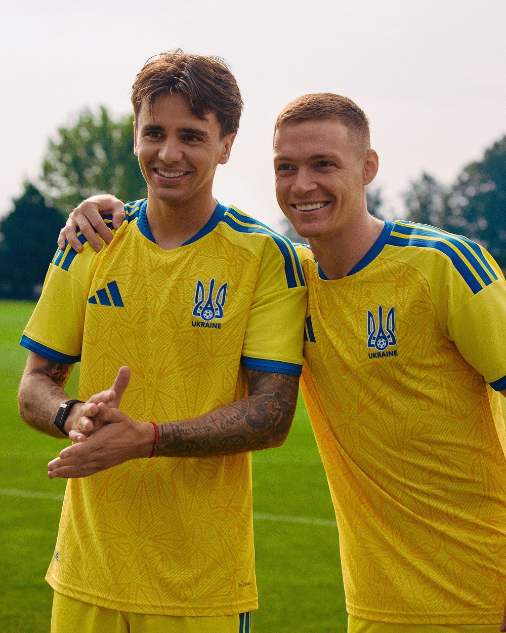 Комплект виготовлено компанією adidas. Дизайн був натхненний гербом Української Народної Республіки, який був створений Василем Кричевським у 1918-му році.
