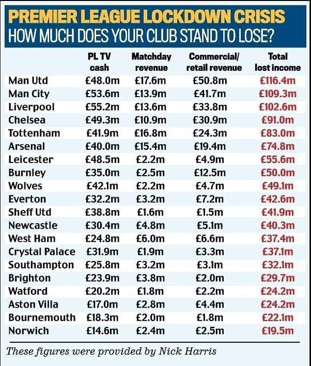 Найбільші втрати будуть у "Манчестер Юнайтед", "Манчестер Сіті" та "Ліверпуля" - 116,4, 109,3 і 102,6 мільйона фунтів відповідно.