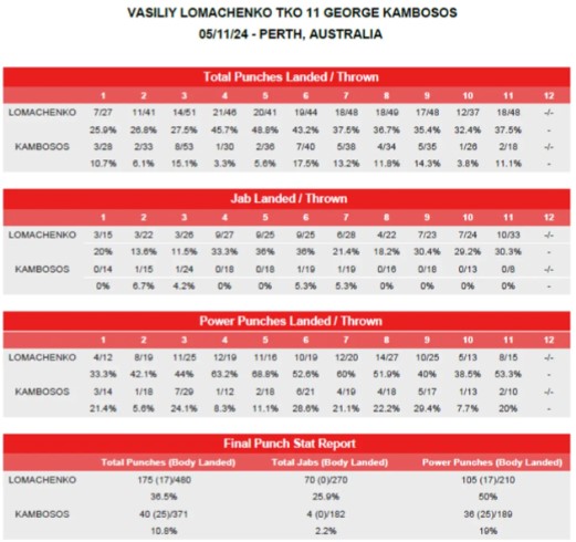 Представлені дані суддівських записок та статистика ударів бою між українським боксером Василем Ломаченком (18–3, 12 KO) та австралійцем Джорджем Камбососом (21–3, 10 KO).
