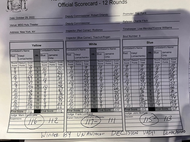 Наведено дані суддівських записок та статистика ударів бою між українцем Василем Ломаченком та американцем Джемейном Ортісом.