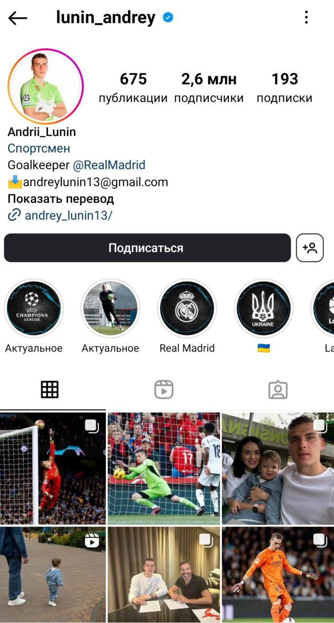 Український воротар мадридського "Реалу" Андрій Лунін став лідером серед українських спортсменів за кількістю підписників у Instagram, повідомляє Tribuna.com.