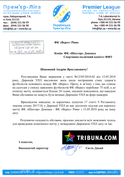 Як повідомляє Football Hub, "Верес" сьогодні, 12 травня, попросив керівництво української Прем'єр-ліги про перенесення матчу з донецьким "Шахтарем" в рамках 31-го туру чемпіонату України. Причиною клопотання стало масове отруєння гравців, однак незабаром Дирекція УПЛ відмовила "Вересу" у перенесенні цієї зустрічі.
