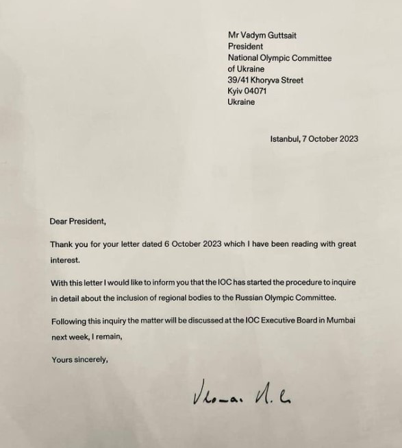 "Дякую за Ваш лист від 6 жовтня 2023 року, який я з великим інтересом прочитав. Цим листом я хотів би повідомити вам, що МОК розпочав процедуру детального вивчення щодо включення регіональних органів до Олімпійського комітету Росії.