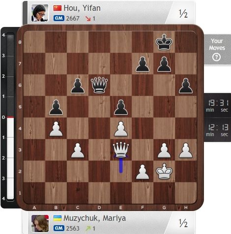 У стартовій партії Музичук грала білими, але не зуміла здобути перемогу. Зустріч завершилася внічию. Таким чином, після першого дня рахунок у протистоянні - 0,5:0,5.