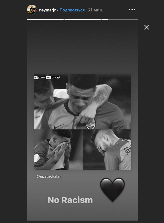 "Ні расизму", – написав Неймар, зробивши репост поста в Instagram ще одного бразильця "Шахтаря" Алана Патріка про цей інцидент.