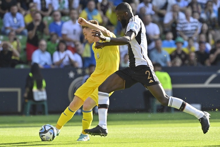 23. ГОООООООЛ! Україна виходить уперед! Тимчик віддав пас із правого флангу, Циганков пропустив, а Мудрик пробив у Рюдігера, після чого м'яч опинився у сітці воріт німців!