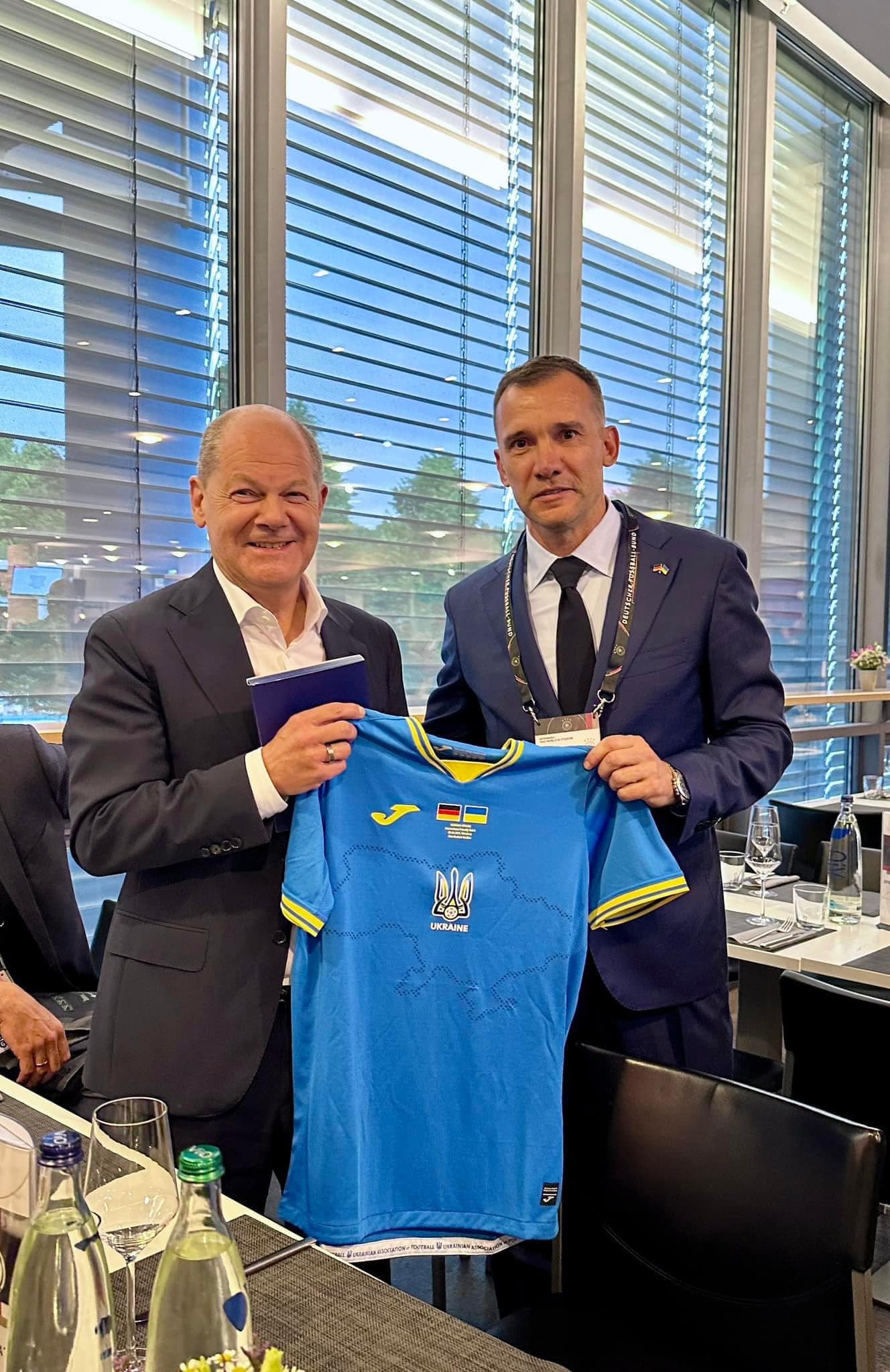 Перед початком матчу президент УАФ Андрій Шевченко зустрівся з канцлером Німеччини Олафом Шольцем