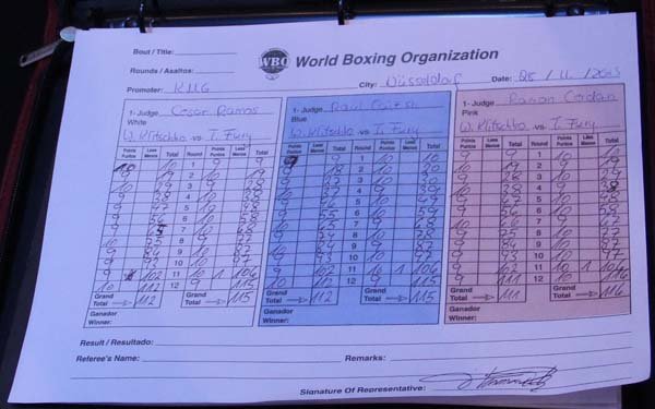 На думку суддів, Кличко виграв не більше чотирьох раундів. При цьому тепер уже екс-володар чемпіонських поясів йшов на нічию після чотирьох раундів, проте потім Ф'юрі пішов у відрив. Кличко не допомогла навіть перемога в дванадцятому раунді - правда, і її зафіксували лише двоє суддів з трьох.
