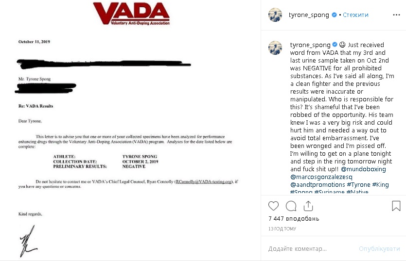 Нідерландський боксер Тайрон Спонг (14-0, 13 КО), який повинен був провести бій з Олександром Усиком (16-0, 12 КО), повідомив про те, що його остання допінг-проба виявилася негативною.