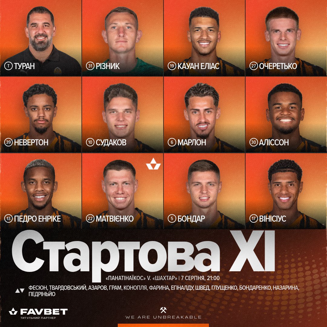 "Шахтар": Різник, Вінісіус Тобіас, Матвієнко, Бондар, Педро Енріке, Марлон, Очеретько, Судаков, Аліссон, Невертон, Кауан Еліас.