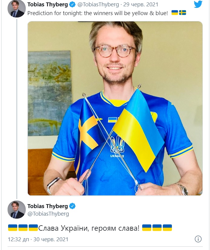 Посол Швеції в Україні Тобіас Тіберг привітав збірну України з футболу з перемогою над Швецією в 1/8 фіналу Євро-2020.
