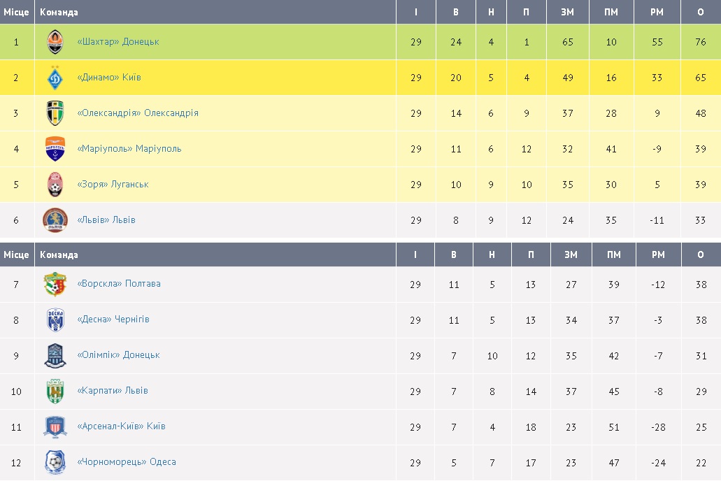Підійшов до кінця 29-й тур української Прем'єр-ліги. Команди в рамках туру традиційно зіграли шість поєдинків. Всього було забито 12 голів. "Шахтар" за підсумками туру достроково завоював чемпіонський титул, обігравши в Запоріжжі "Зорю" (1:0). Це 12-е чемпіонство для "гірників" в УПЛ, а також третє поспіль.