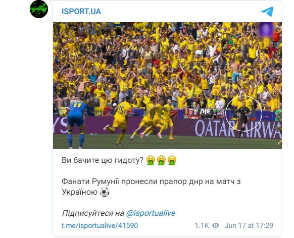 Як повідомляє Isport.ua, під час поєдинку на трибуні вболівальників збірної Румунії було вивішено прапор так званої "Донецької народної республіки".