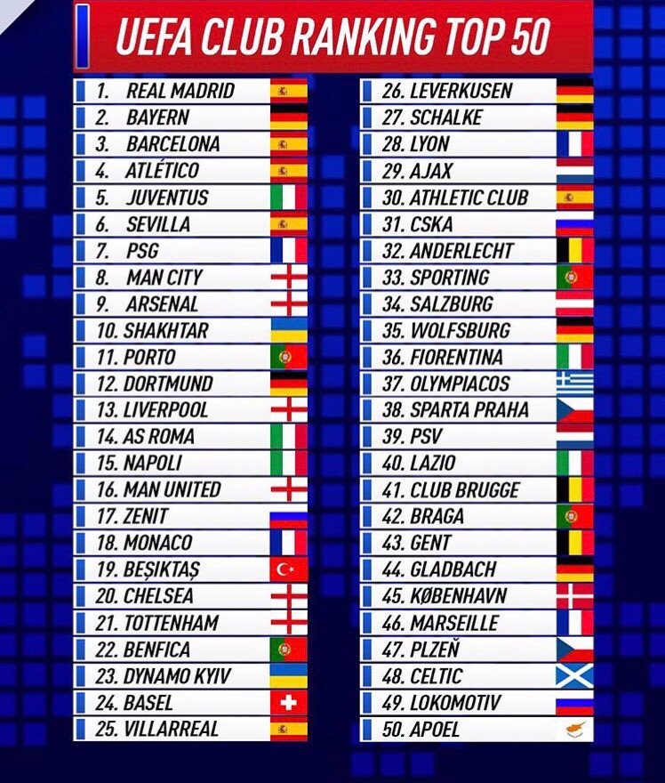 УЄФА оновив рейтинг клубів за підсумками першого раунду групового етапу єврокубків.