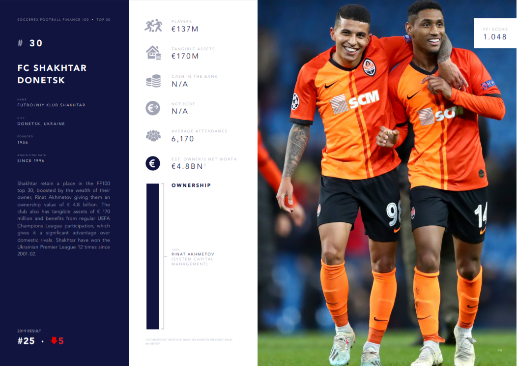 "Шахтар" посів 30 місце з індексом 1, 048. Минулого року "помаранчево-чорні" зайняли 25 позицію.