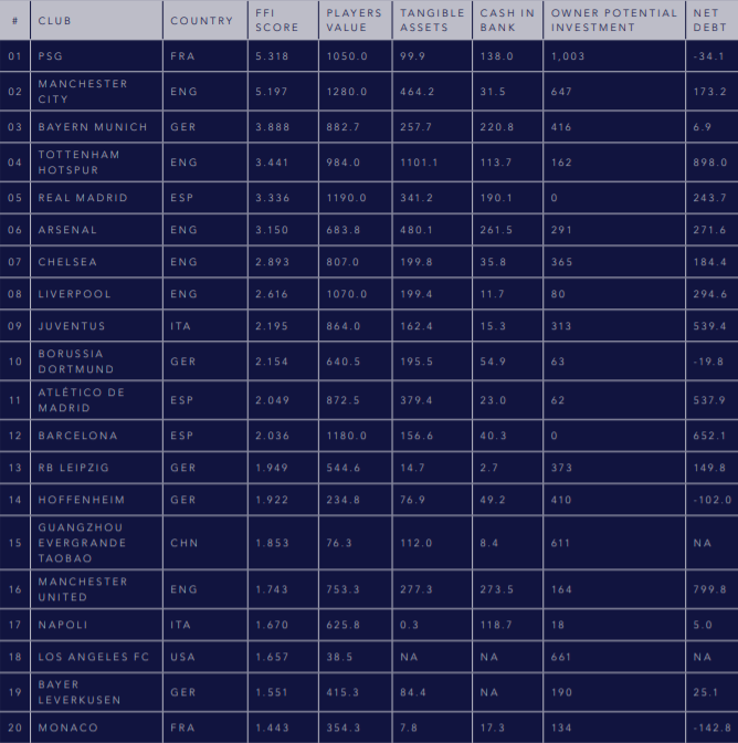 Перше місце в рейтингу посів "ПСЖ" з індексом 5,318, змістивши з лідерської позиції "Манчестер Сіті" (5,197). "Містяни" розташувалися на другій сходинці. Трійку лідерів замикає "Баварія" (3,888).