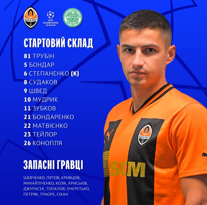 "Шахтар": Трубін, Тейлор, Бондар, Матвієнко, Конопля, Степаненко, Зубков (Траоре, 61), Бондаренко, Судаков (Очеретько, 77), Мудрик, Швед (Петряк, 61)