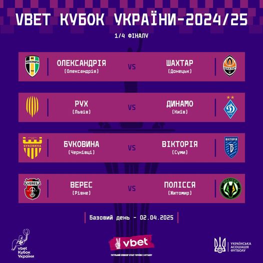 Відбулося жеребкування 1/4 фіналу Кубка України з футболу сезону-2024/25.