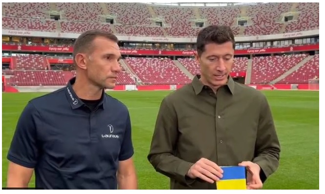 Андрій Шевченко подарував Роберту Левандовському синьо-жовту капітанську пов'язку, подякувавши йому та всьому польському народу за підтримку України у війні з Росією.