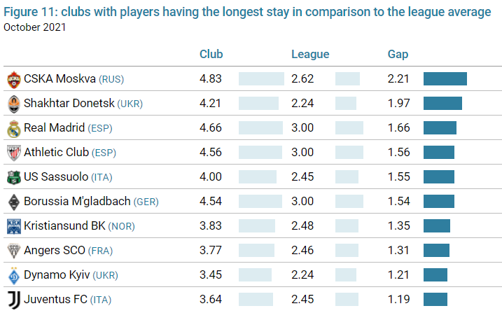 У середньому футболіст затримується у донецькому клубі на 4,21 року, у київському – на 3,45, завдяки чому "гірники" посідають 2-е місце у цьому списку, а динамівці – 9-те.