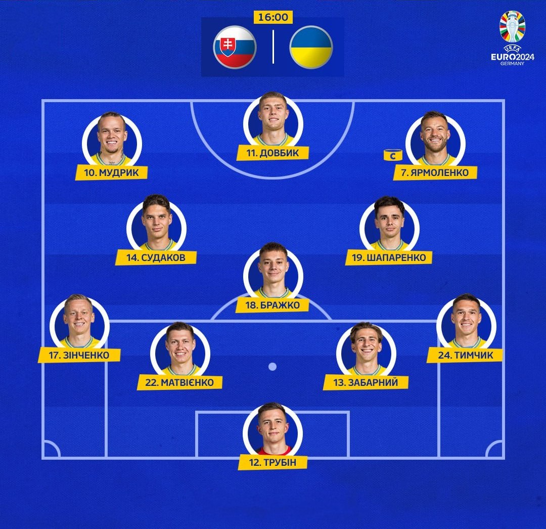Україна: Трубін, Тимчик, Забарний, Матвієнко, Зінченко, Судаков, Бражко, Шапаренко, Ярмоленко, Мудрик, Довбик