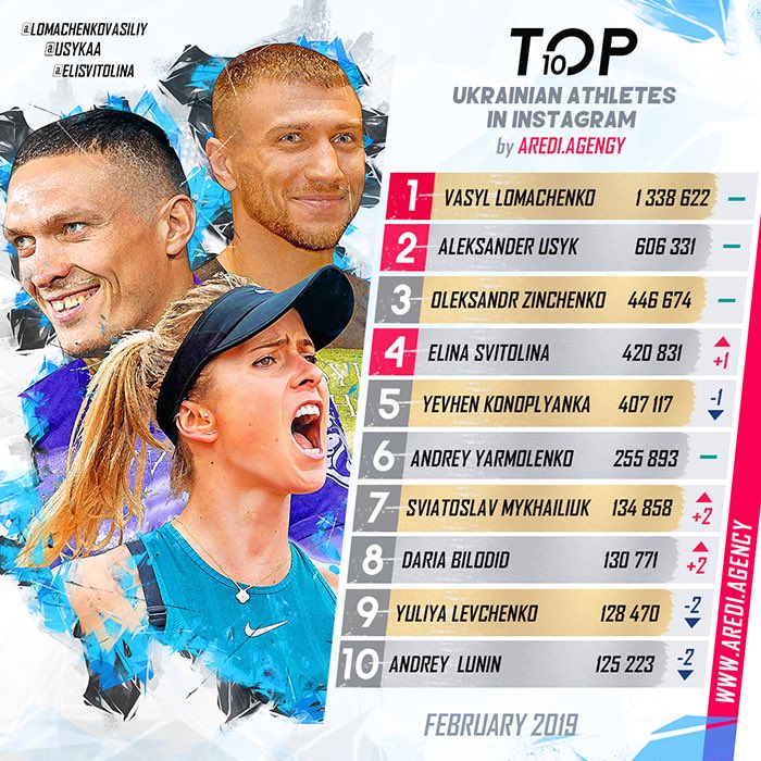Найпопулярнішим українським спортсменом серед користувачів соціальної мережі залишається Василь Ломаченко (більше 1,3 мільйона підписників), за яким розташувався Олександр Усик (606 тисяч).
