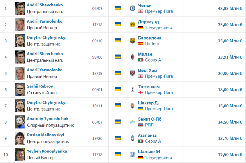 На першому місці залишається перехід форварда Андрія Шевченка з "Мілана" в "Челсі". А в трійку входять угода "Динамо" і дортмундської "Боруссії" за Андрію Ярмоленку і трансфер Дмитра Чигринського з "Шахтаря" в "Барселону".
