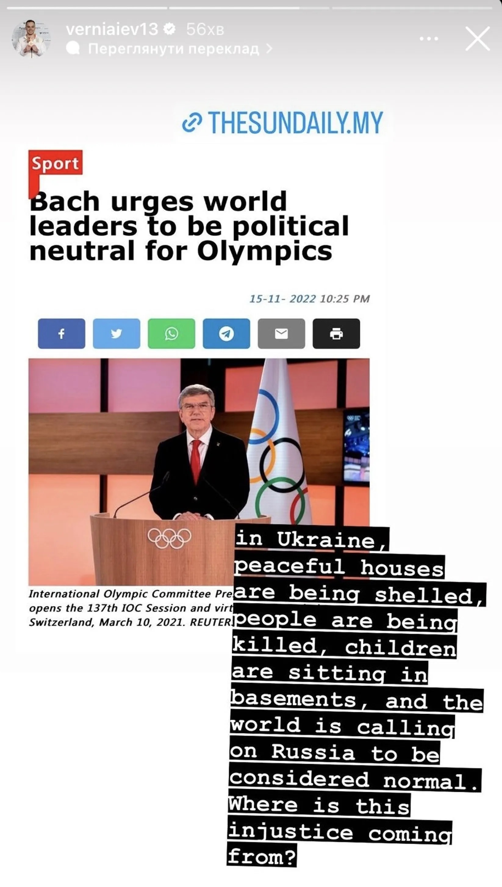 Олімпійський чемпіон зі спортивної гімнастики Олег Верняєв після чергового ракетного обстрілу з боку РФ відповів на заклики президента МОК Томаса Баха повернути на змагання росіян.