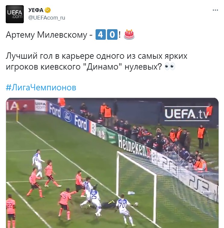 Організація розмістила на своїй сторінці у Twitter відео гола українського футболіста у ворота "Барселони". УЄФА привітала Мілевського з 40-річчям, тоді як офіційно йому виповнилося лише 38 років.