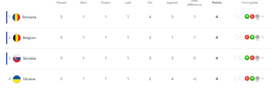 Усі команди у квартеті набрали по чотири очки, а до 1/8 фіналу пробилися Словаччина, Бельгія та Румунія.