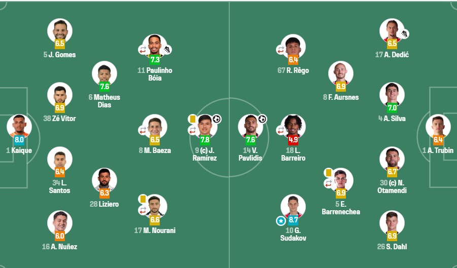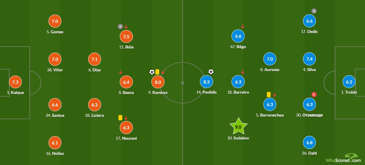 Трубін за свою гру у воротах отримав оцінки 6,2 і 6,4 бала від порталів WhoScored і SofaScore відповідно. Водночас Судаков отримав оцінки 9,0 і 8,7 — український хавбек став найкращим гравцем поєдинку.