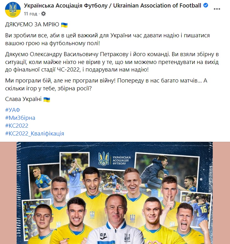 "Ви зробили все, щоб у цей тяжкий для України час давати надію та пишатися вашою грою на футбольному полі! Спасибі Олександру Васильовичу Петракову та його команді. Ви взяли збірну у ситуації, коли майже ніхто не вірив у те, що ми можемо претендувати на вихід до фінальної стадії ЧС-2022, і подарували нам надію. Ми програли бій, але не програли війну. Попереду у нас багато матчів... А скільки ігор у тебе, збірна Росії?" – написано на сторінці УАФ у Facebook.