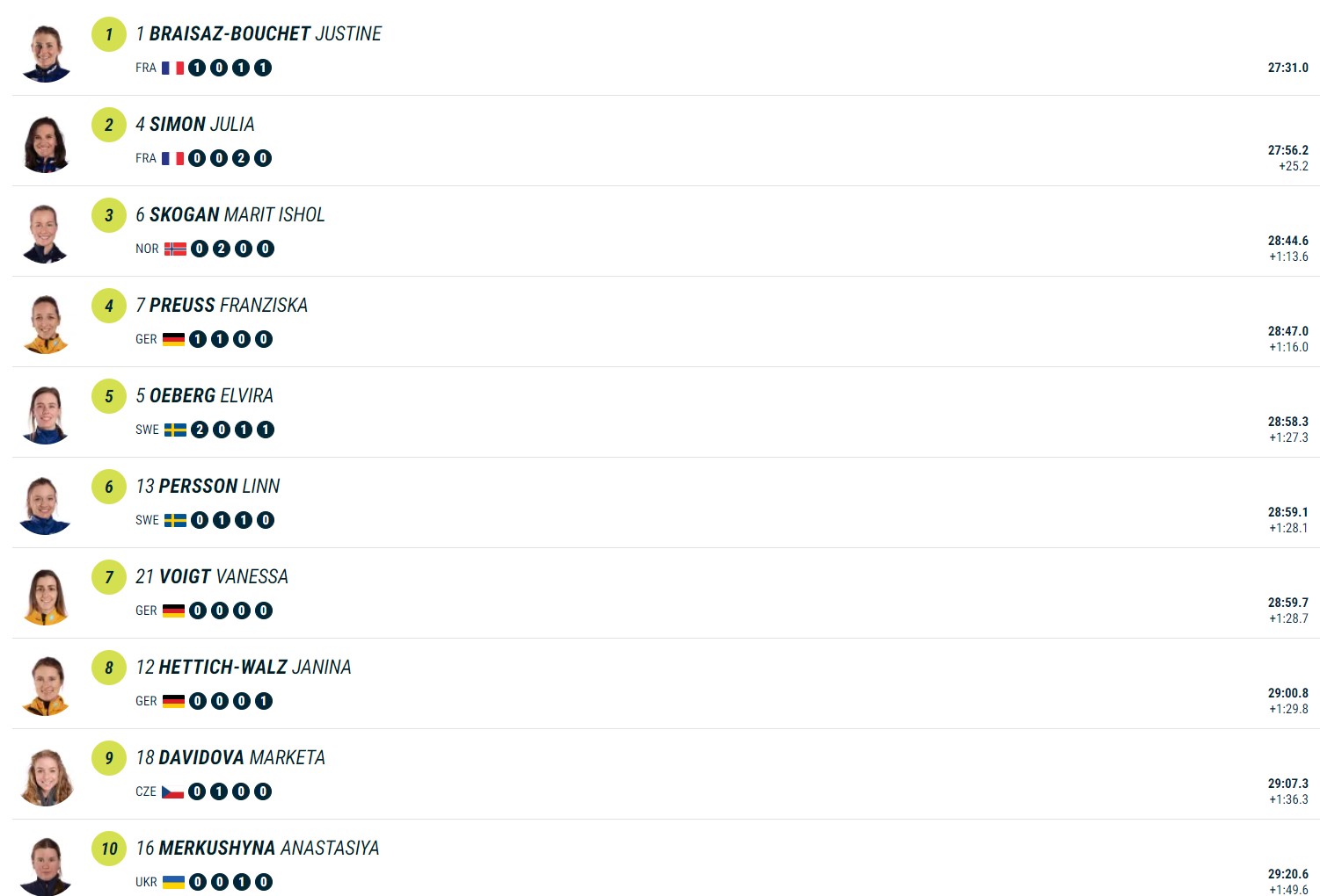 Перемогу здобула француженка Жюстін Брезаз-Буше, а до топ-3 увійшли Жулія Сімон (Франція) та Маріт Ісхол Скоган (Норвегія).