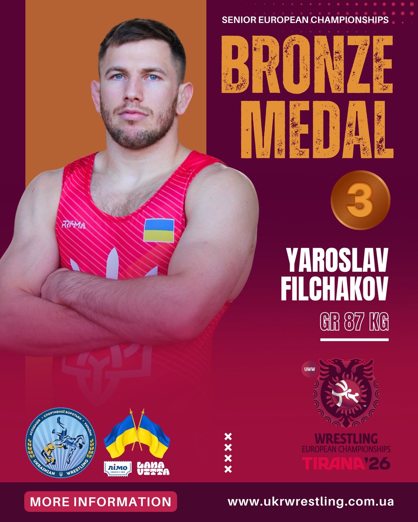 Український борець Ярослав Фільчаков виграв бронзову нагороду чемпіонату Європи-2026 з греко-римської боротьби.