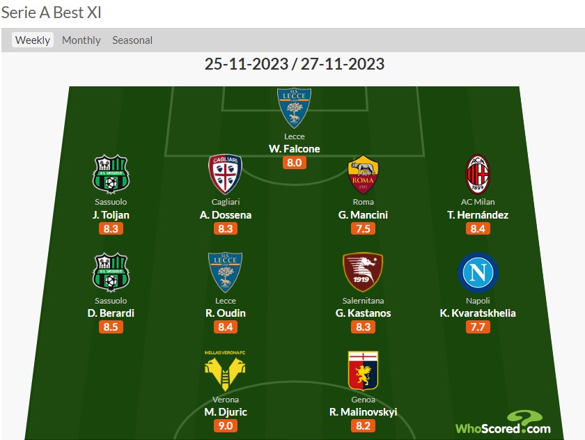 Портал WhoScored поставив українцю оцінку 8,2 та включив його до збірної 13-го туру Серії А на позиції нападника.