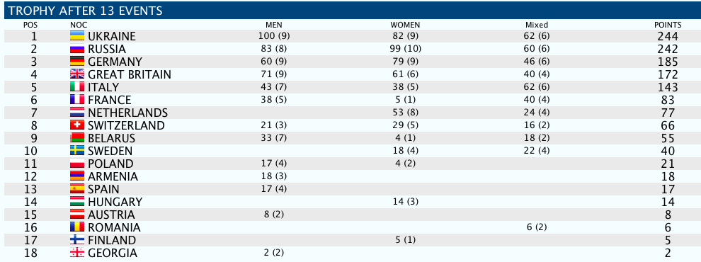 Тим не менш, трофей за перемогу в командній першості все одно дістався Україні. Наші стрибуни зуміли обійти росіян на два очки і вперше у своїй історії виграти залік. У трійку увійшла збірна Німеччини.