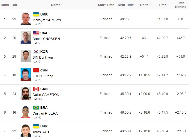 Перемогу серед спортсменів з ураженням опорно-рухового апарату в лижних гонках сидячи на дистанції 15 кілометрів здобув Максим Яровий. Ще один українець Тарас Рудь у цій же гонці став сьомим.