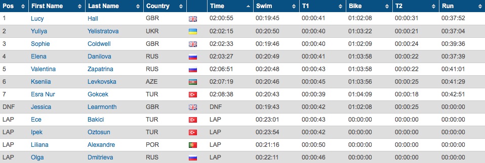 У плаванні Єлістратова (2:02.15) показала сьомий результат, на велосипеді - четвертий час, а в бігу стала кращою, що дозволило їй на 18 секунд випередити британку Софі Колдуелл (2:02.33). Першою з відривом в 1 хвилину 20 секунд стала ще одна британка Люсі Холл (02:00.55).