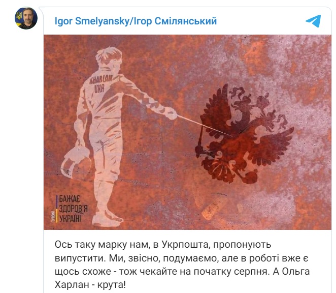 "От таку марку нам в "Укрпошті" пропонують випустити. Ми, звичайно, подумаємо, але в роботі вже є щось схоже – чекайте на початку серпня. А Ольга Харлан – крута!", – написав Ігор Смілянський у своєму Telegram-каналі.