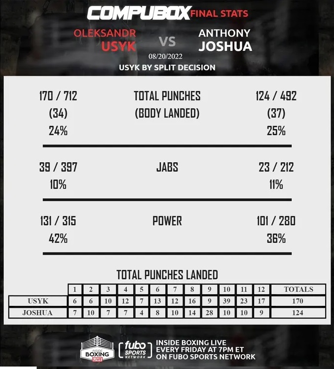 Також портал CompuBox розмістив статистику бою. Усик завдав всього 712 ударів, з яких 170 досягли цілі. В активі Джошуа 492 удари, з яких 124 були точними. Українець викинув 397 джебів (39 точних), а у британця на рахунку 212 джебів (23 точні).