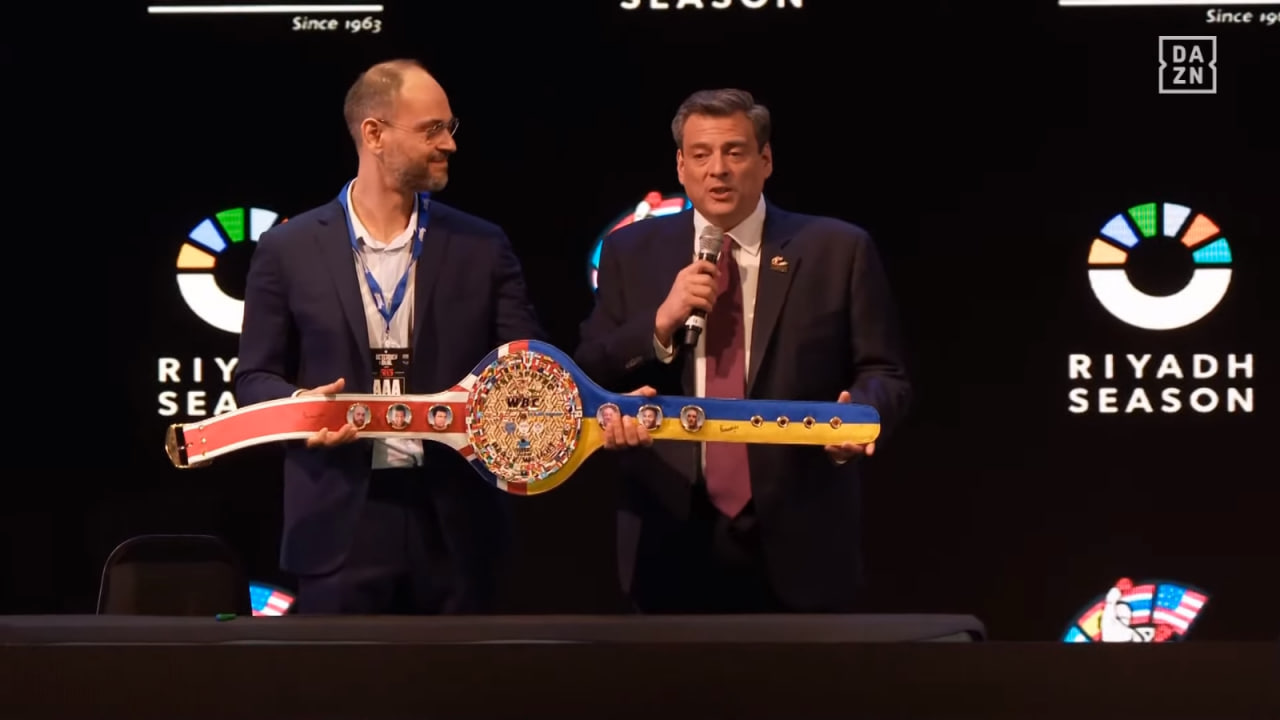 Чемпіонська нагорода оформлена у кольорах українського та британського прапора. Цей титул зараз належить Фьюрі, тоді як Усик володіє поясами WBO, WBA, IBF та IBO.