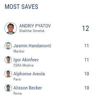 У першому матчі групового етапу "Шахтар" зустрічався з "Наполі" (2:1). Друге і третє місце ділять голкіпер "Марібора" Ясмін Ханданович і воротар ЦСКА Ігор Акінфєєв.