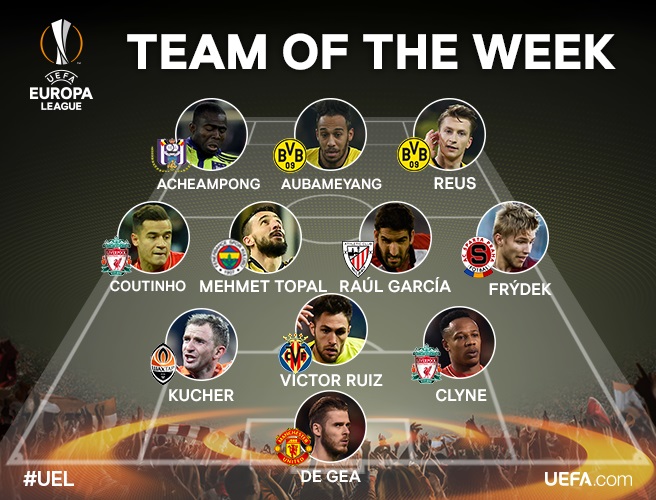Символічна збірна тижня: Давід Де Хеа ("Манчестер Юнайтед"), Натаніель Клайн ("Ліверпуль"), Віктор Руїс ("Вільярреал"), Олександр Кучер ("Шахтар"), Мартін Фрідек ("Спарта"), Рауль Гарсія ("Атлетик"), Мехмет Топал ("Фенербахче"), Коутіньо ("Ліверпуль"), Марко Ройс ("Боруссія"), П'єр-Емерік Обамеянг ("Боруссія"), Френк Ачімпонг ("Андерлехт").