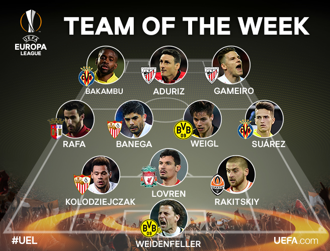 Символічна збірна тижня: Роман Вайденфеллер ("Боруссія"), Ярослав Ракицький ("Шахтар"), Деян Ловрен ("Ліверпуль"), Тімоті Колодзейчак ("Севілья"), Деніс Суарес ("Вільярреал"), Юліан Вайгль ("Боруссія"), Евер Банега ("Севілья"), Рафа Сілва ("Брага"), Кевін Гамейро ("Севілья"), Аріц Адуріс ("Атлетик"), Седрік Бакамбю ("Вільярреал")