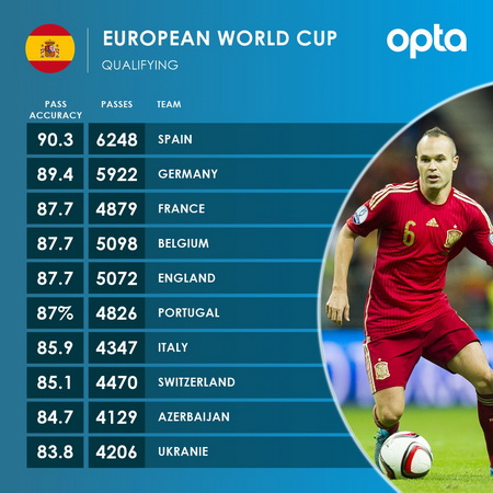 Підопічні Андрія Шевченка віддали 4206 пасів з точністю до 83,8%. За цим показником українська команда займає 10-е місце.
