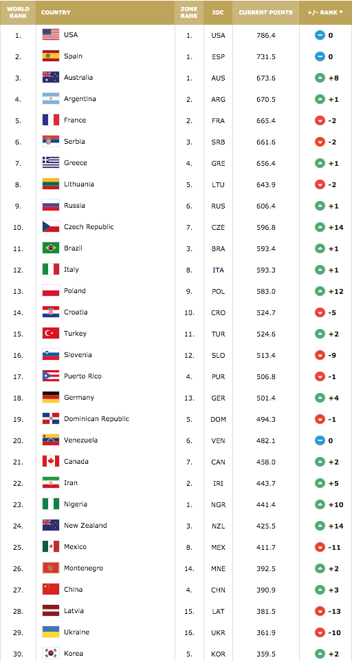 Незважаючи на невдалий результат на турнірі в Китаї, зберігає лідерство в рейтингу збірна США, другою йде Іспанія, яка виграла світову першість, третьої - Австралія.