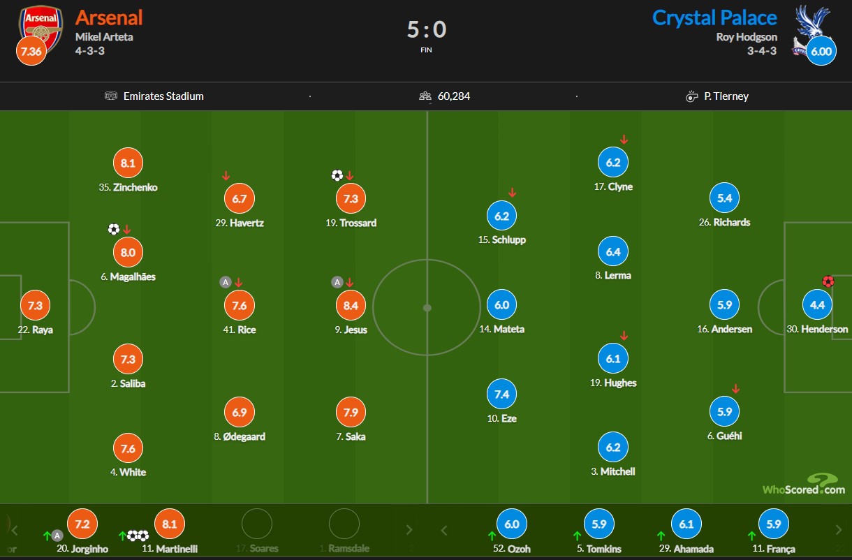 Голами у складі "канонірів" відзначилися Габріел, Троссард та Мартінеллі (дубль), а автогол на свій рахунок записав Гендерсон.