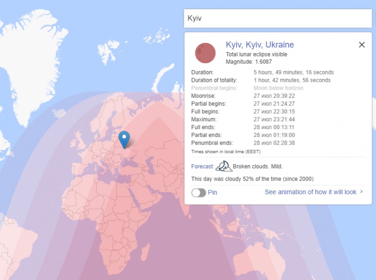 Спостерігати за частковим місячним затемненням можна буде вже о 21:24 27 липня, повне місячне затемнення почнеться о 22:30, а свого піку досягне о 23:21. Загальна тривалість усіх фаз затемнення складе шість годин 14 хвилин.
